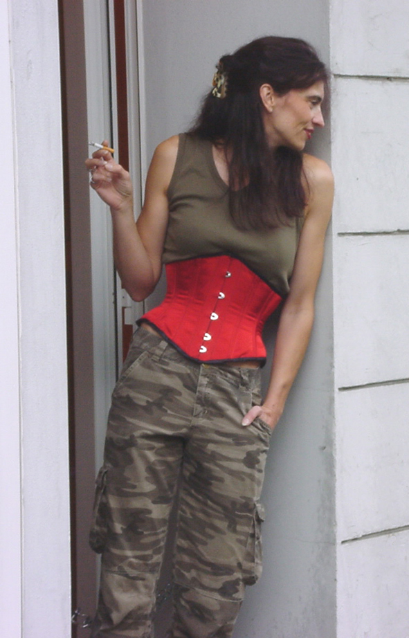 Satin rot mit schwarzer Einfassung und Schnürung sowie mit schwarzen Nähten