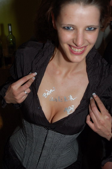 zur Event-Übersicht Es wurde in der smarten Bar waschbütt noch am Vormittag fleißig gewerkelt, denn schließlich sollte die erste Vernissage in diesen Räumlichkeiten gelingen. Als um 20h die Fotomodelle (Bara, Michiko, Steffi, Tatie, Tanja und Patricia -einherzliches Dankeschön an Euch!) in ihren "Kalender-Korsetts" die waschbütt betraten war alles perfekt: die Bilder hingen, das Faß war angezapft und es wurde schon viel gelacht! Kunden, neue Korsettinteressierte und auch neugierige Stammgäste der waschbütt genossen den Abend bei ein, zwei oder mehr Gläsern Uerige vom Faß oder was das Herz sonst so begehrte: Frank und André von der waschbütt waren ein super Team! Selbst eine Anreise aus Siegburg oder Haltern-Lavesum war nicht zu weit. Es wurde viel nachgeschnürt, Knotentechniken ausgetauscht und selbst Frank von der waschbütt wollte seine Wette einlösen und hat sich ein Korsett anziehen lassen ;-) Nicht nur die Signierung der Kalender durch die Models war an diesem Abend angesagt, sondern auch das Signieren der Dekolletés der Modelle vom Fotografen Christian Ritter! ...hier nun ein paar Bilder (nach erfolgter Zensur ;-) sowie Presseberichte aus dem Viertel unter www.einkaufen-duesseldorf-flingern.de :