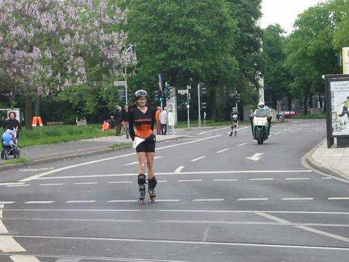 Den Düsseldorfer Rheinmarathon haben wir dieses Jahr ein bißchen für Öffentlichkeitsarbeit mißbraucht: Gertie hatte sich in den Kopf gesetzt, ihren 1. Marathon im Korsett auf Blades zu fahren und mit dem alten Vorurteil aufzuräumen, die "Dinger" sind ja soooo unbequem.  Die Kommentare an der Strecke waren so ermutigend, daß der Besenwagen sie nicht mehr eingeholt hat. Tja, eine Wette, die ich gerne verloren habe...  (Der Einsatz wird hier nicht verraten)